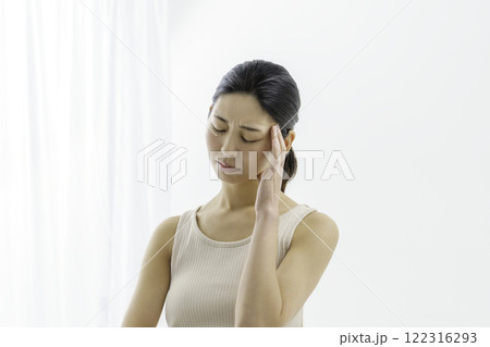 額を抑える白背景の若い女性 頭痛 病気