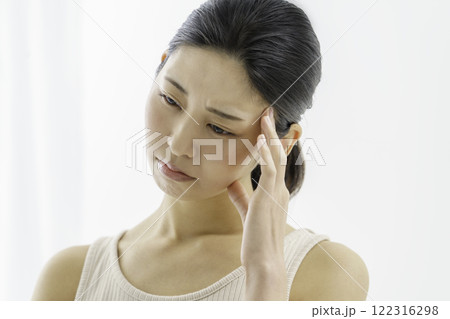 額を抑える白背景の困った顔の若い女性 頭痛 病気
