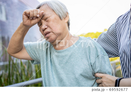 Tired asian senior woman has a bad headache suffer from migraine,high blood pressure,sick elderly people touching aching head in outdoor at park feel vertigo,faint,dizzy,pain,attack of severe headache