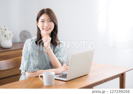 自宅の部屋でパソコンを使う若いかわいいカジュアルな服の女性カメラ目線