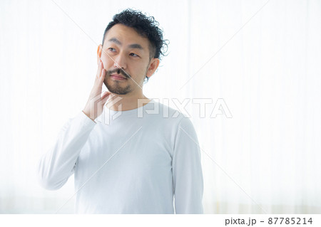 髭を触って悩む短髪の男性 閉眼