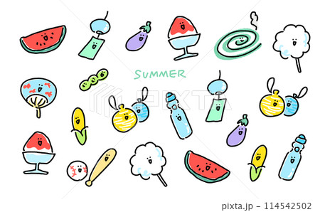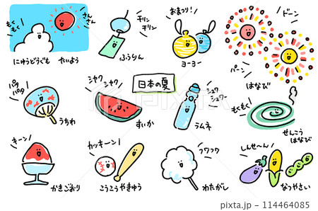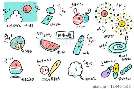 漫画風 日本の夏の素材セット 顔つき デザイン シンプルな線画イラスト