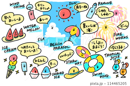 漫画風 日本の夏の素材セット 顔つき デザイン シンプルな線画イラスト