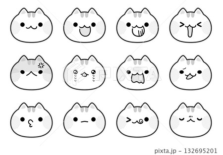 猫の表情アイコン(白黒)/かわいい猫の喜怒哀楽アイコンセット