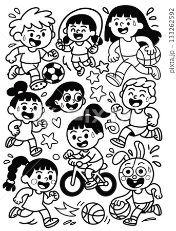 Happy children playing soccer, basketball, skipping rope, riding bicycle, cartoon style