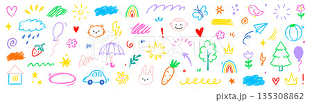 Cute kid baby icon set. Hand drawn kid doodle marker stroke with cute color rainbow, sun, cloud childish background. Cartoon sketch children flower, car, house icon elements. Vector