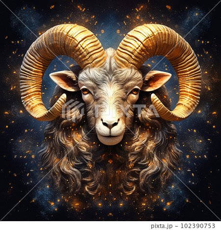 Zodiac sign of Aries, fantasy ram with magic golden horns, generative AI.