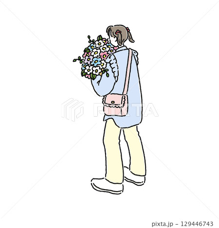 花束を持った後ろ姿の女性 線画