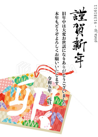年賀状素材 新春 干支のかわいいウサギと正月の絵馬の組み合わせのイラスト 十二支
