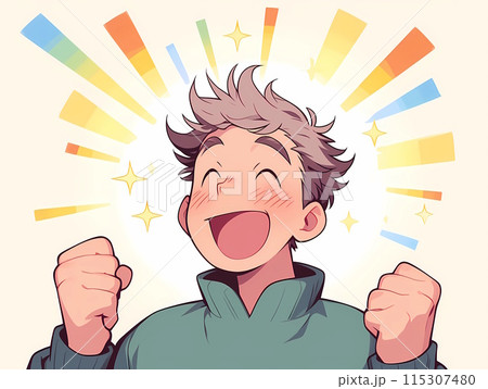 ガッツポーズしながら満面の笑顔で喜ぶ男性
