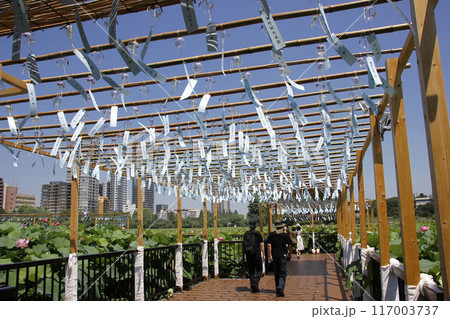 風鈴の音の下を歩く。ハスに花に囲まれた歩道は異世界のように神秘的
