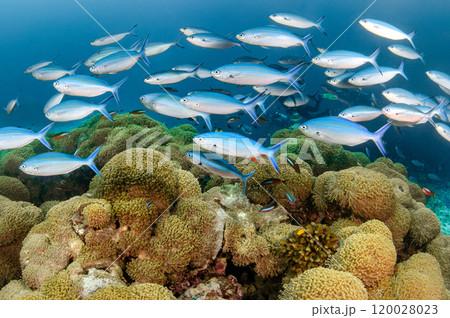 School of Rainbow runner swimming over Goniopora coral reef in Andaman Sea