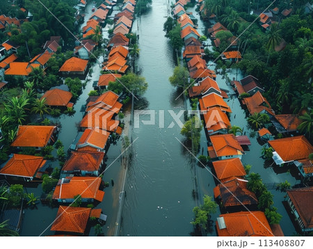 Aerial view of flooding city. Natural disaster damages houses and vehicles. Extreme flood and storm aerial photo.