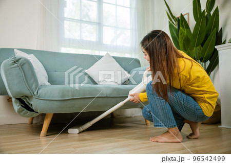 Housewife female dust cleaning floor under sofa or couch furniture with vacuum cleaner, Happy Asian young woman with accumulator vacuum cleaner at home in living room, household and housework concept