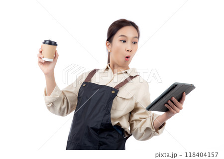 Portrait young barista woman holding coffee cup and tablet wearing apron with excited isolated.