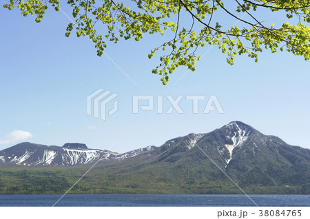 新緑の支笏湖、樽前山、風不死岳 千歳市
