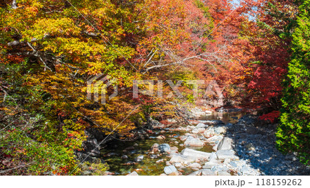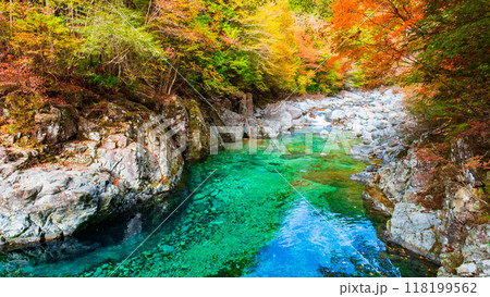東京 紅葉に染まる秋川渓谷 石舟橋