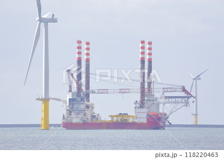 洋上風力発電、着床式建設中(秋田県 潟上市)