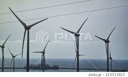 Offshore wind turbine farm in the sea, ocean