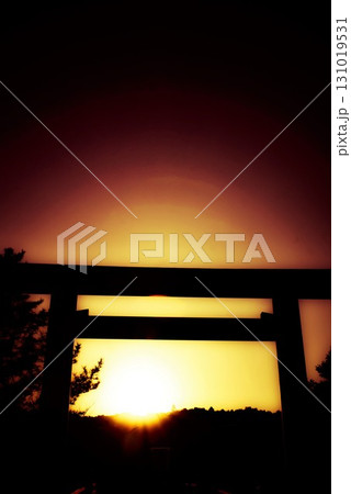 早朝の伊勢神宮内宮の風景 宇治橋鳥居と日の出