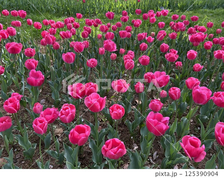チューリップ畑に咲くピンクとオレンジのチューリップ