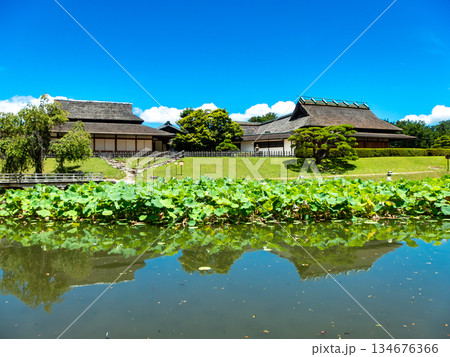 夏の岡山 後楽園の清々しい景色 花葉の池から望む延養亭と栄唱の間