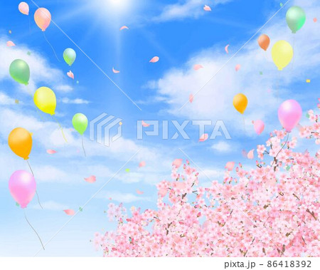 光差し込む青空にカラフルな風船と華やかな桜と花びら舞い散る春の桜フレーム背景素材
