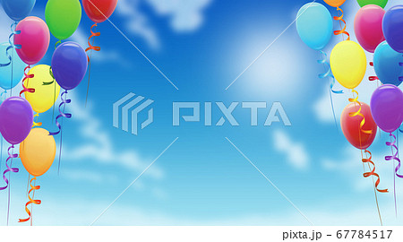 ハッピーで楽しそうなイメージの背景イラスト:青空を飛ぶ風船バルーン自然風景バックグラウンド