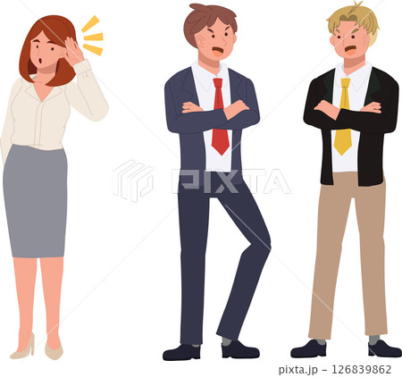 office gossip concept. two men talking secretly and curious woman eavesdropping in office.