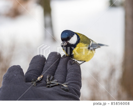 A big tit with a sunflower seed in its beak sits on a limb of a coniferous tree on a winter afternoon, with a feeder and pork fat - a traditional winter treat for tits - hanging on the tree nearby.