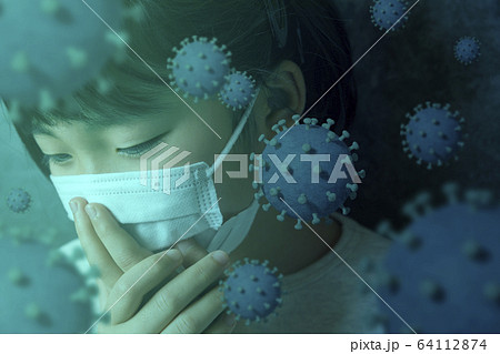 ウイルス都市とマスク姿の小学生 感染症イメージ