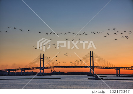 朝焼けの横浜ベイブリッジ-目覚める街と飛び立つ鳥たち