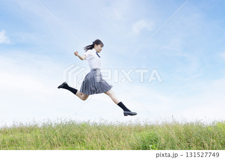 青空をバックにジャンプする高校生