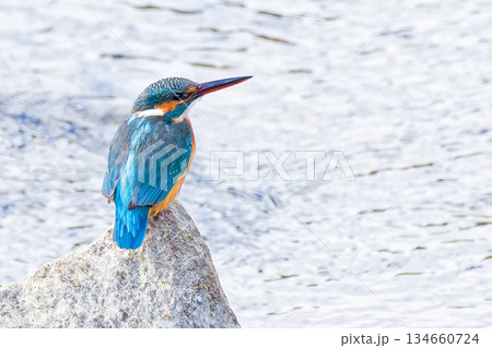 岩に留まるカワセミ雌の背面