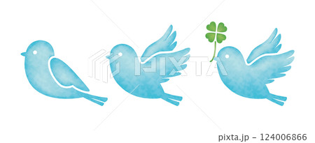 空を飛んでいる青い小鳥と四つ葉のクローバーの水彩風ベクターイラストセット
