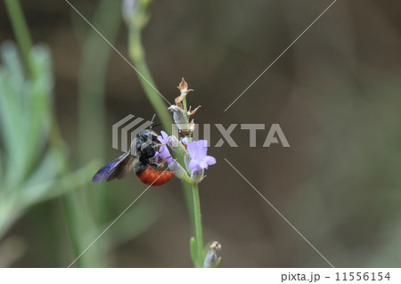 生き物 昆虫 ハラアカハキリヤドリバチ、ラベンダーの蜜を堪能中。赤い舌(中舌)が見えます