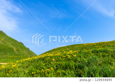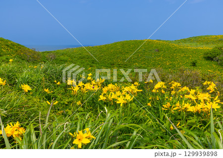 新潟県佐渡市願 佐渡島外海府海岸の大野亀周辺のトビシマカンゾウ群生と日本海