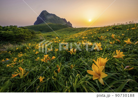 新潟県佐渡市 佐渡島 夕暮れの大野亀トビシマカンゾウ群生