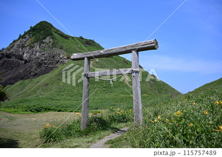 新潟県佐渡市願 佐渡島外海府海岸のトビシマカンゾウ群生と鳥居越しの大野亀