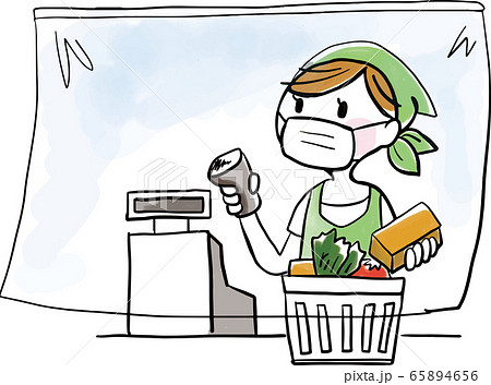 人物:レジ 飛散防止フィルム マスク 飛沫感染 予防 感染予防 スーパー お買い物 お会計