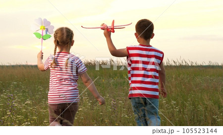 Little boy and girl with favorite toy plane and windmill flower walk on green meadow backside view. Happy little boy with girl hold toys in sunset field. Boy and girl siblings vacation in rural nature