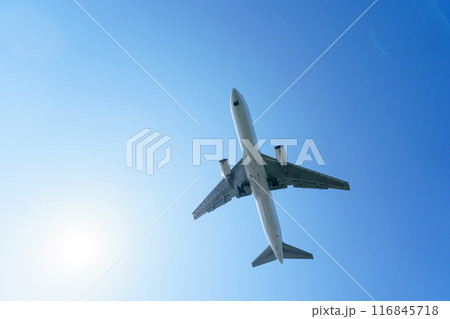 青空を飛行する旅客機の機体下部
