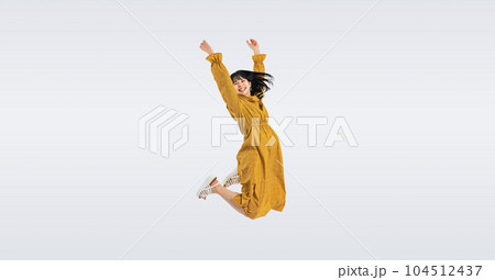 ジャンプするカジュアルウェアの女性 切り抜き全身写真