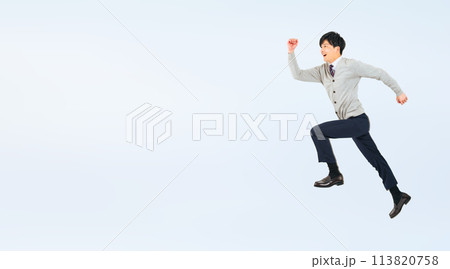グレーバックで走り出すスーツを着た男性