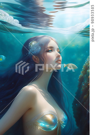 青い海の中で微笑む人魚の美少女。光が差し込み魚が泳ぐ。