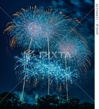 天然デザイン花火の背景素材・青煙をまとう飛遊星の涼しげな打上げ花火・横位置
