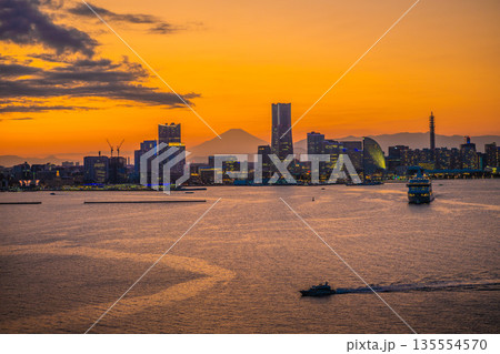 日本の横浜都市景観飛鳥Ⅱや富士山、横浜みなとみらいなどを望む