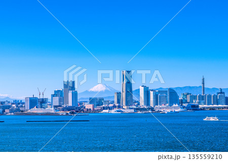 日本の横浜都市景観横浜みなとみらいや飛鳥Ⅱ、富士山などを望む