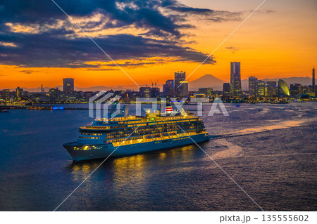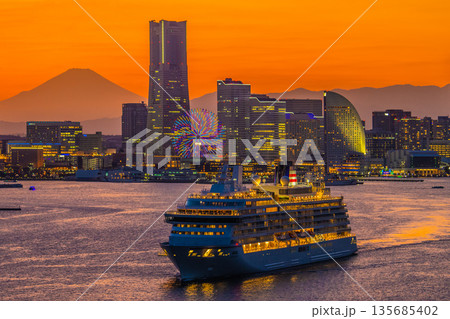 日本の横浜都市景観3隻日本の豪華客船、にっぽん丸、飛鳥Ⅱ、三井オ号が横浜港に。夕日…希望の明日へ