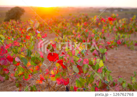 Autumn golden red vineyards sunset in Utiel Requena